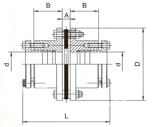 | 規(guī)格 | 孔徑d mm | D mm | L mm | A mm | B mm | 重量 kg | 許用轉(zhuǎn)速 rpm | 公稱扭矩 N.m | 許用補(bǔ)償量 | |