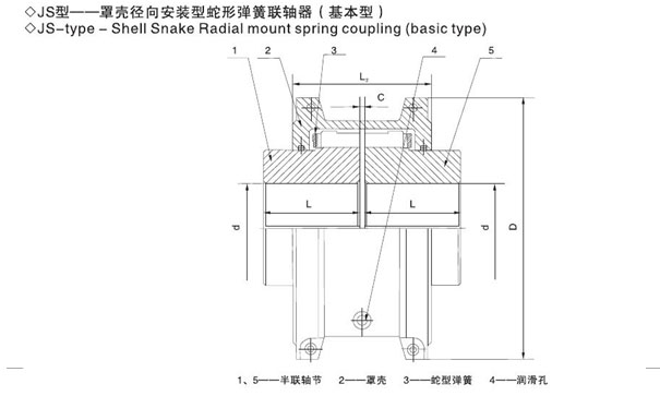 蛇形彈簧聯(lián)軸器的金屬彈性元件為幾組嵌在兩半聯(lián)軸器齒間是蛇形的彈簧。一種常見的結(jié)構(gòu),在兩半聯(lián)軸器的凸緣上制有特定形狀的齒,齒與齒間嵌著截面為矩形的蛇形彈簧。為了防止彈簧在離心力作用下甩出,以及避免彈簧與齒接觸處發(fā)生干摩擦,要用封閉的殼體罩住,里面并注以潤滑油。工作時,通過齒與彈簧的互壓,將主動軸的扭矩傳遞至被動軸。